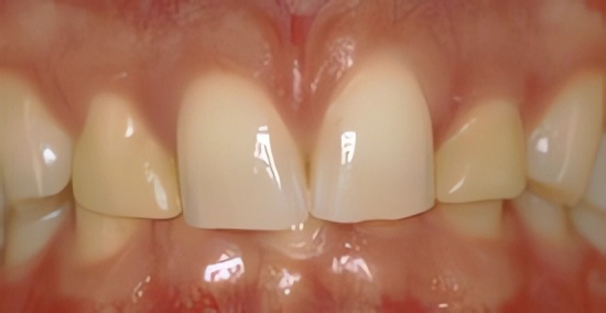 Before: Front (left) Central tooth has a poor restoration. Does not look natural and is not contoured properly to match the gumline of the rest of the teeth.