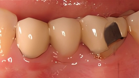 After: Replaced with an All Porcelain Crown (no metal). Tooth is now contoured to match the rest of the gumline. Restored tooth looks very natural and matches the shape and color of the patient’s teeth.