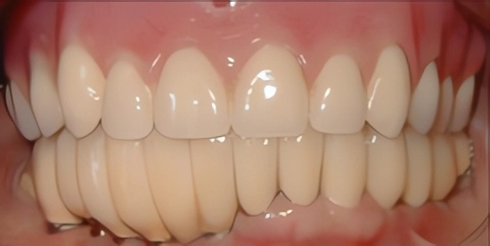 After: Great smile, chewing function, and facial tissue support possible with an Upper Denture that is supported with Implants and Lower Implants and Crowns.
