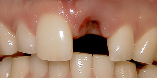 Before: Patient needs a Single Tooth Replacement of one Upper Central Incisor.